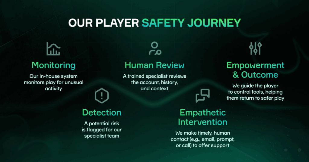 - Overkommeligheds- og risikotjek: Spil måles i forhold til risikoudløsere, og om nødvendigt udføres økonomiske risikovurderinger for at understøtte samtaler og fastlægge de korrekte grænser.